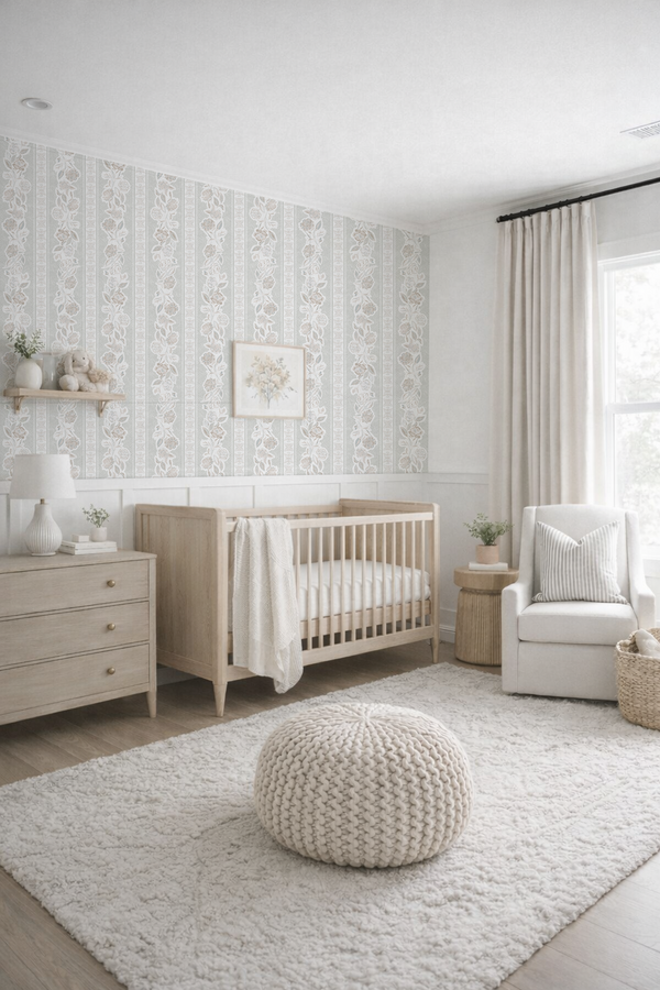 In a nursery, camellias have long symbolized devoted, enduring love and gentle strength. Used in wallpaper, they can serve as a quiet reminder to parents of the strength they embody each day as they care for their little one.