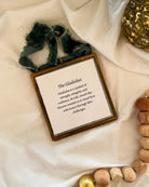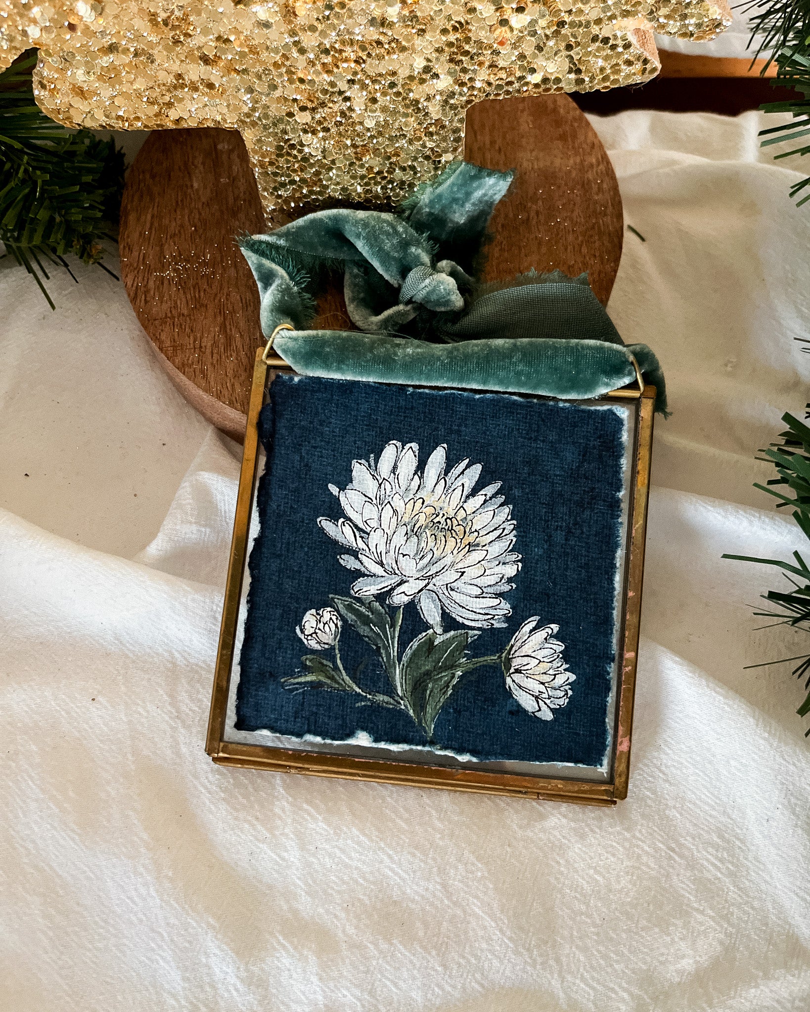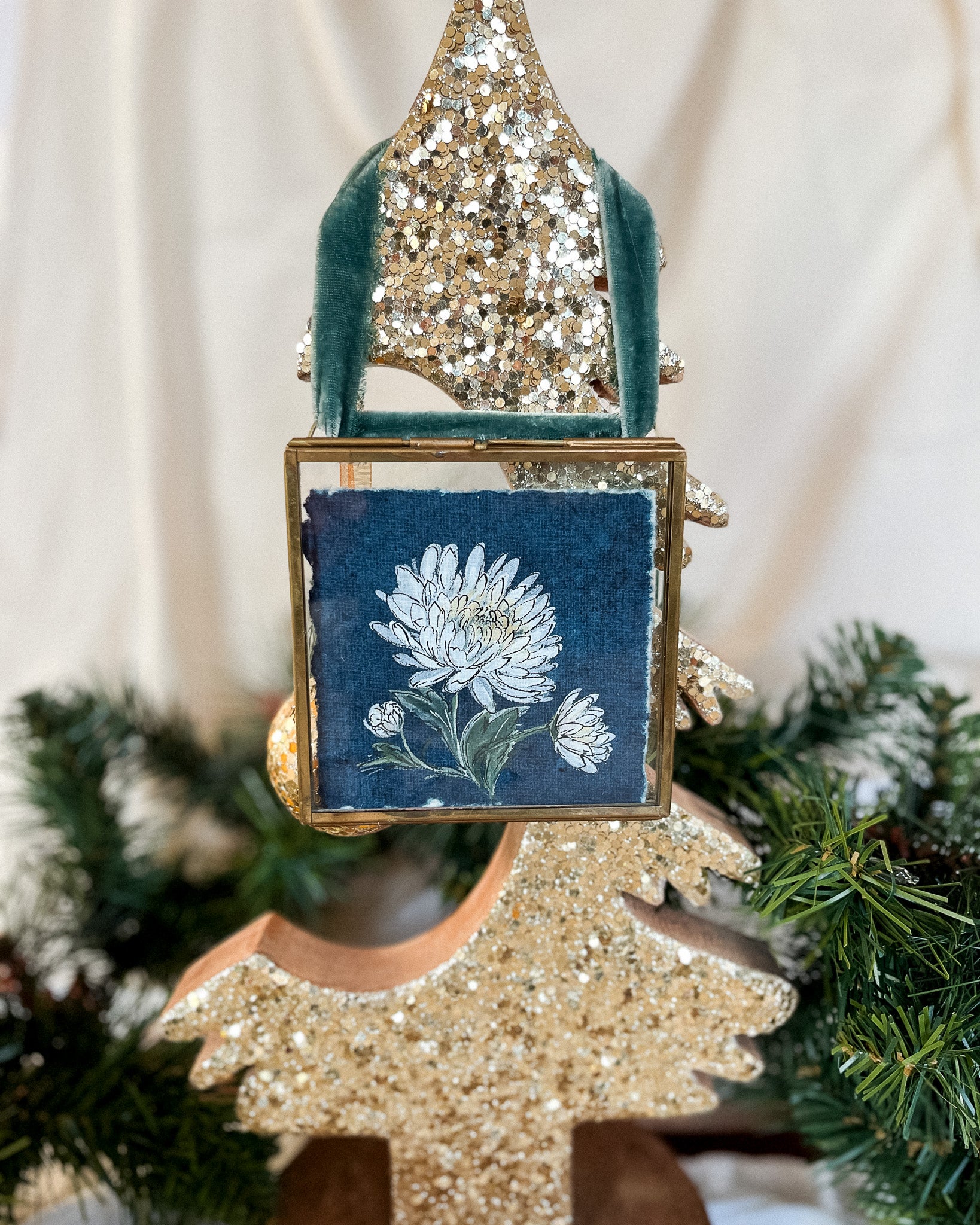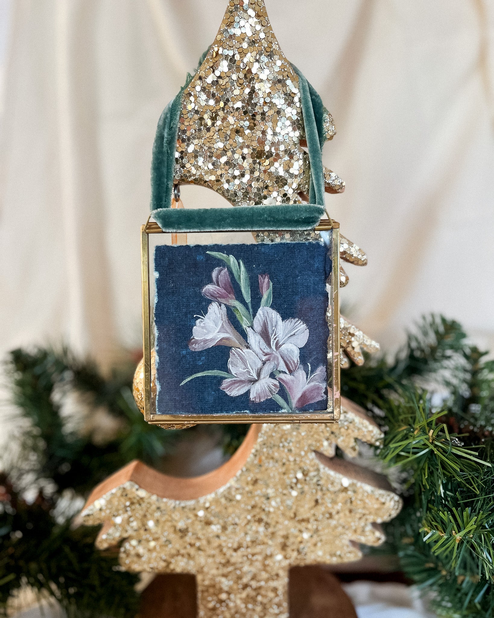 - Size: 4" x 4" brass and glass frame with a slider clasp closure, adorned with a velvet ribbon for hanging.
