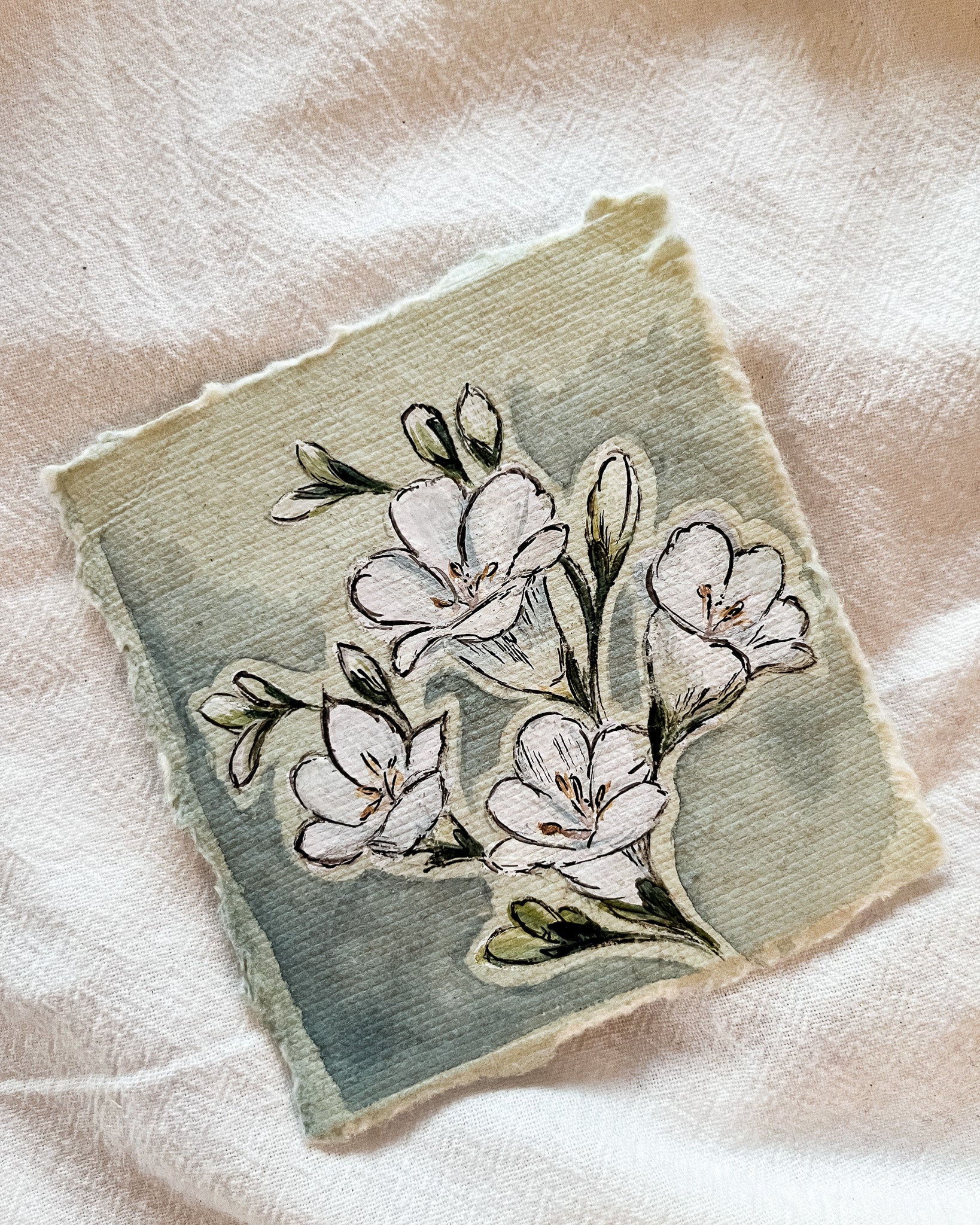 - A double-sided linen card is included beautifully explaining the symbolism of each flower. Display the card behind the art to share the meaningful stories or remove it to showcase both paintings simultaneously