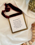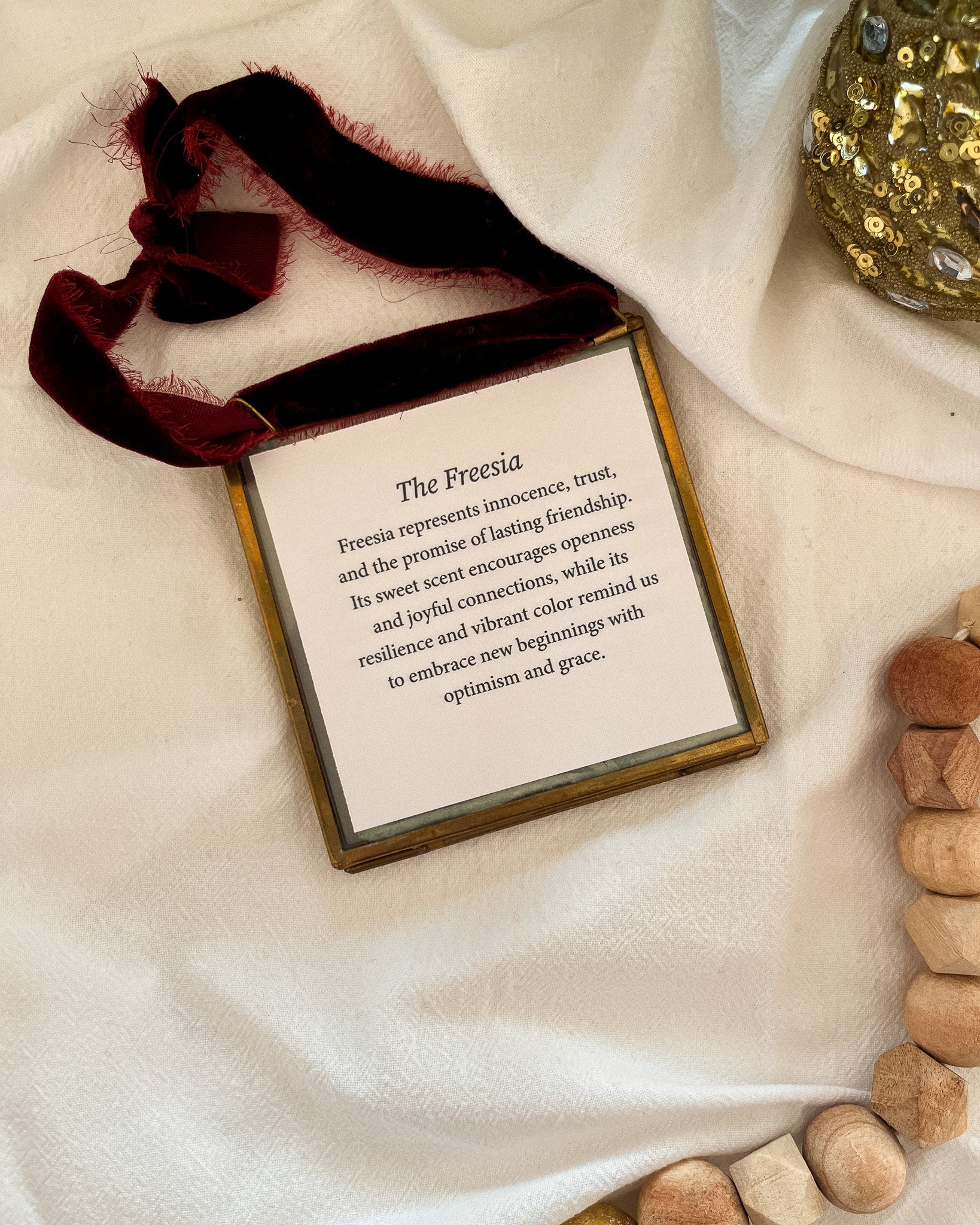 - Size: 4" x 4" brass and glass frame with a slider clasp closure, adorned with a velvet ribbon for hanging.