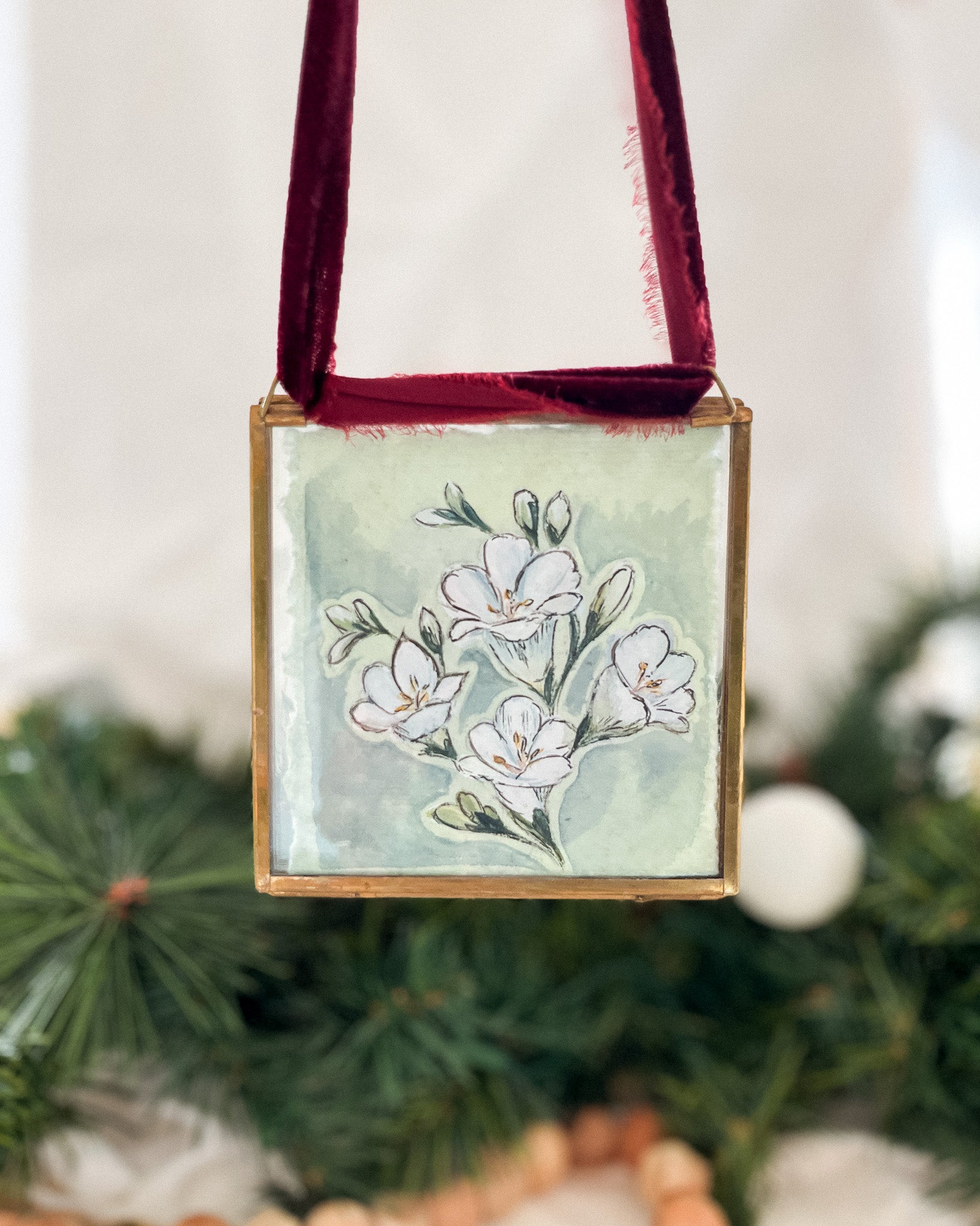- Each ornament features two original floral paintings---one on each side-- on handmade or premium watercolor paper