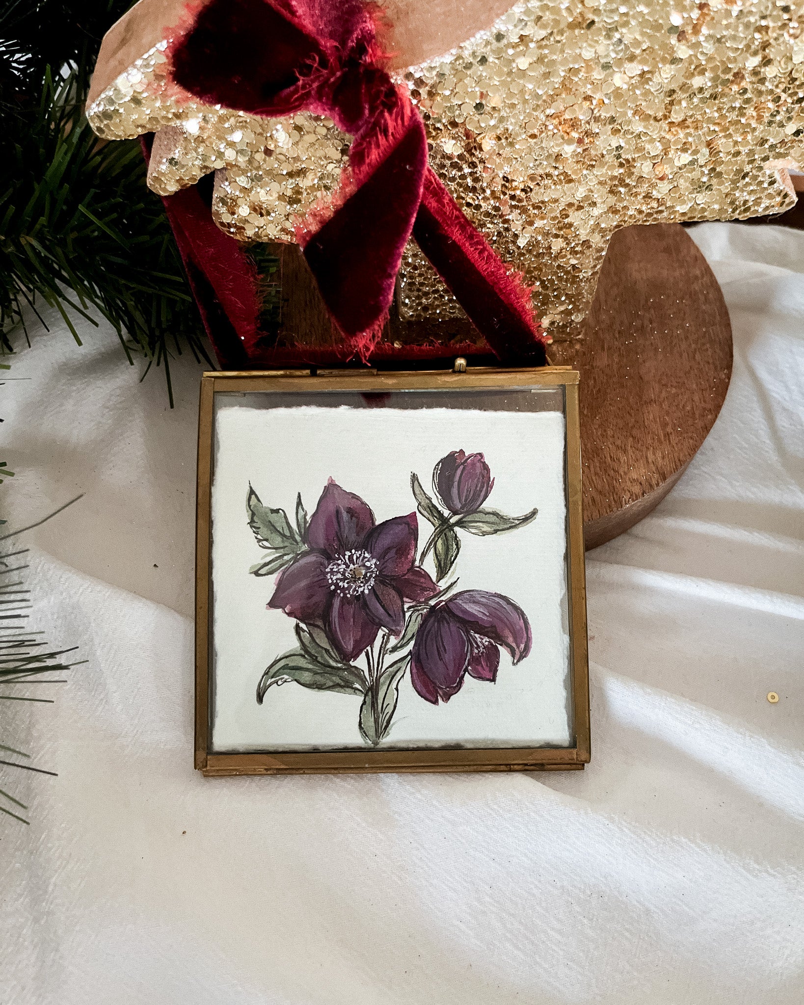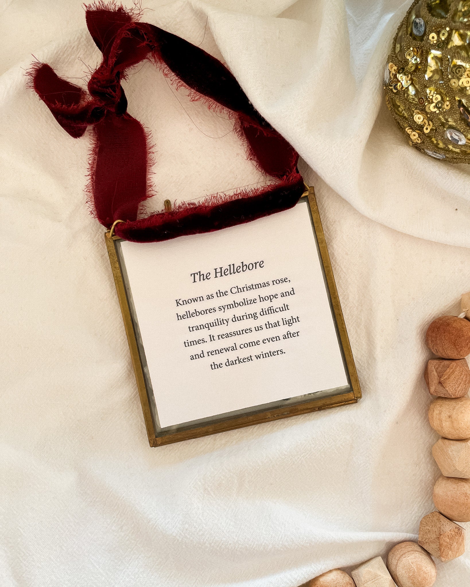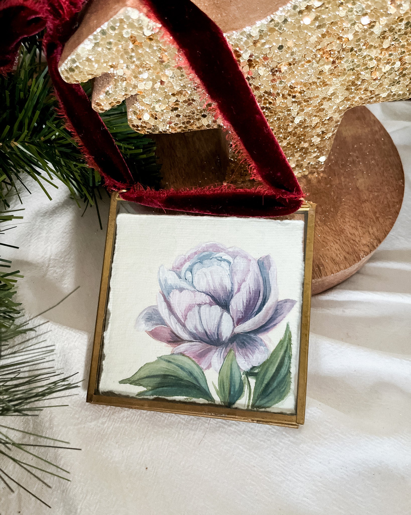 - Size: 4" x 4" brass and glass frame with a slider clasp closure, adorned with a velvet ribbon for hanging.