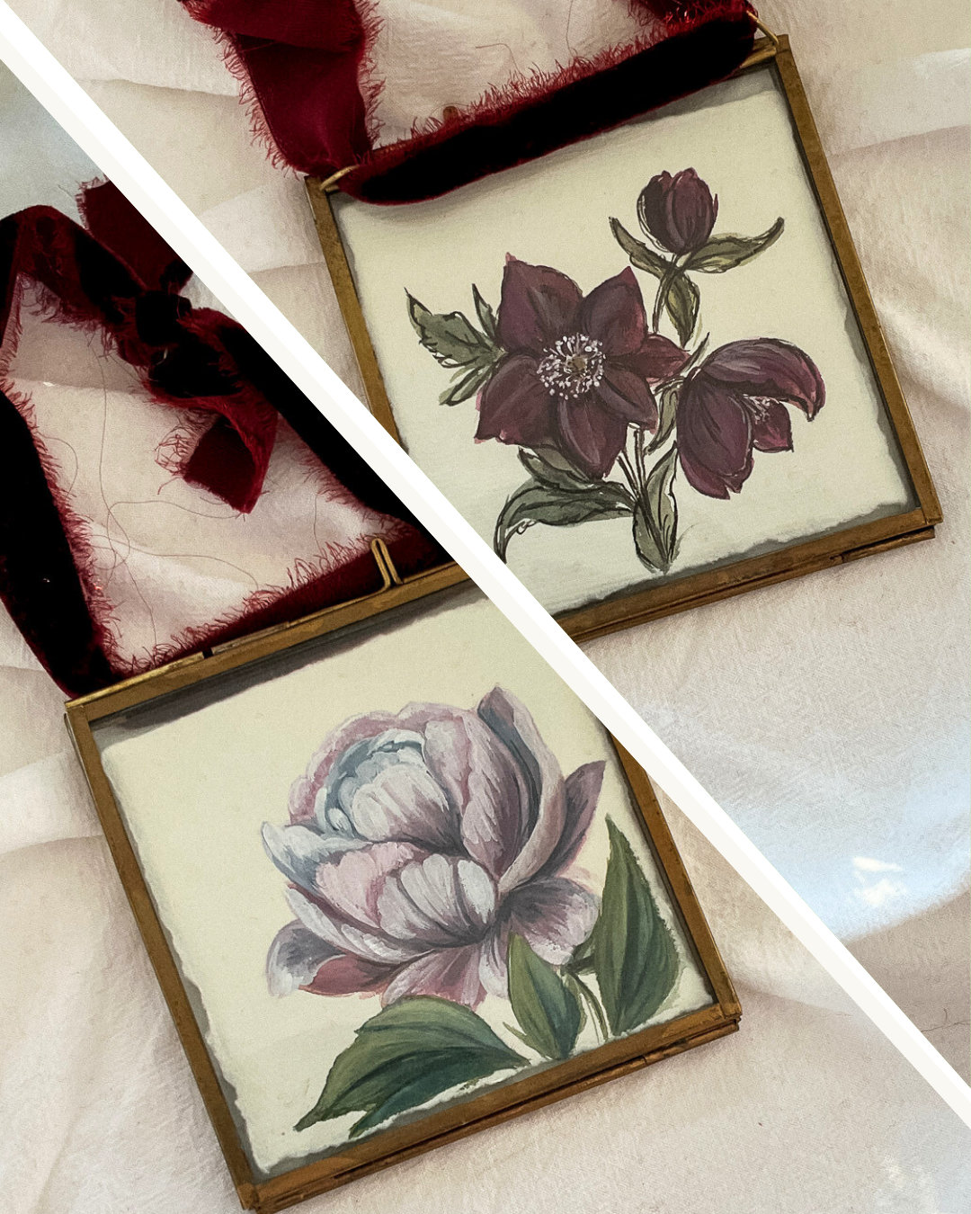 - A double-sided linen card is included beautifully explaining the symbolism of each flower. Display the card behind the art to share the meaningful stories or remove it to showcase both paintings simultaneously