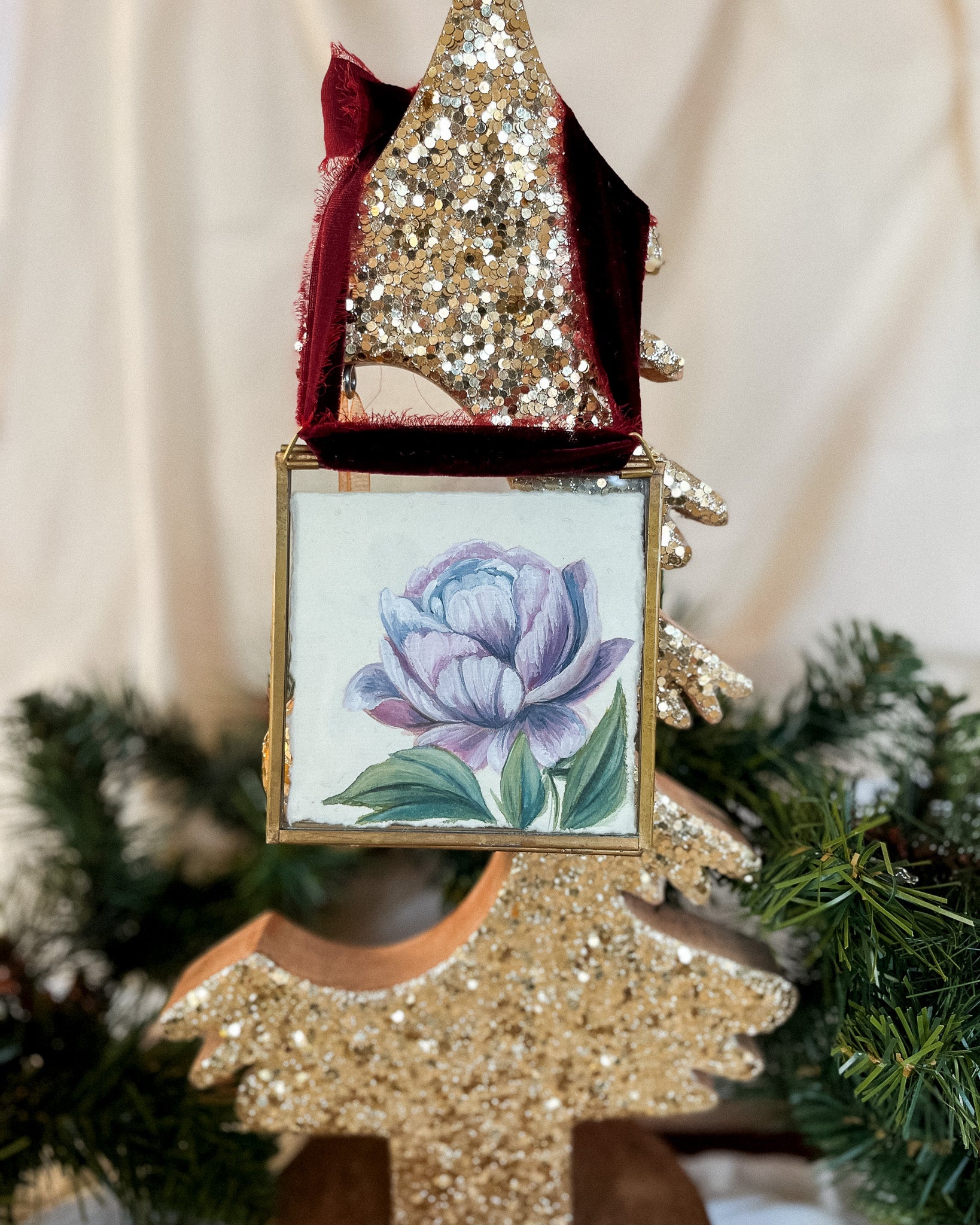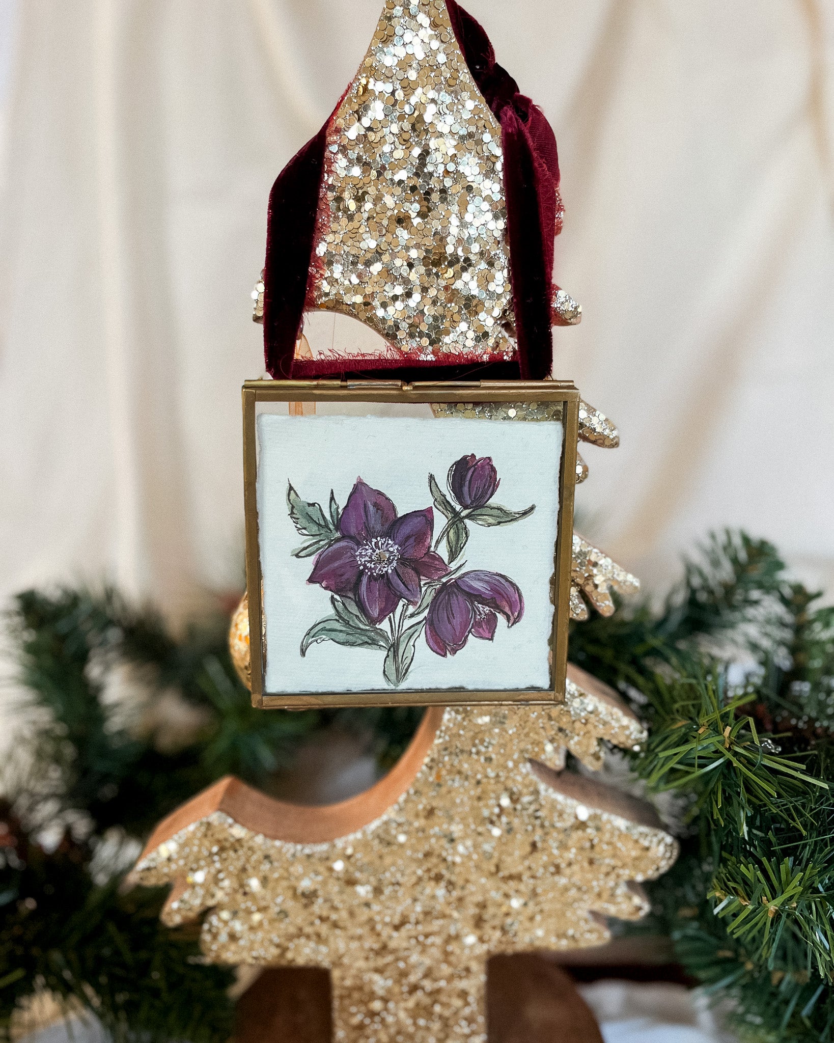 - Each ornament features two original floral paintings---one on each side-- on handmade or premium watercolor paper