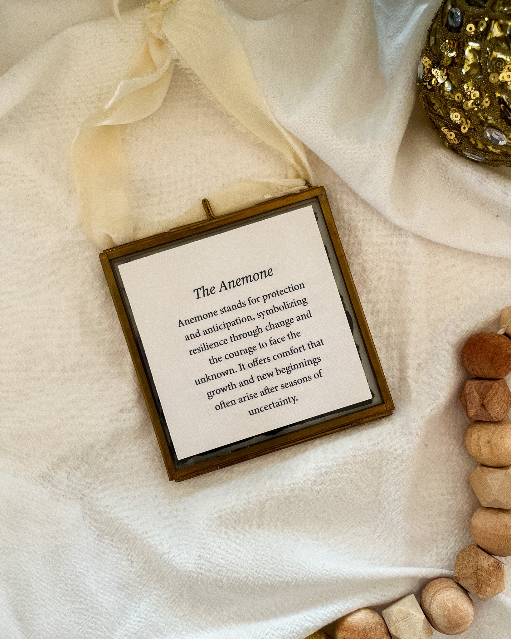 Anemone: The anemone stands for protection and anticipation, symbolizing resilience through change and the courage to face the unknown. It offers comfort that growth and new beginnings often arise after seasons of uncertainty.