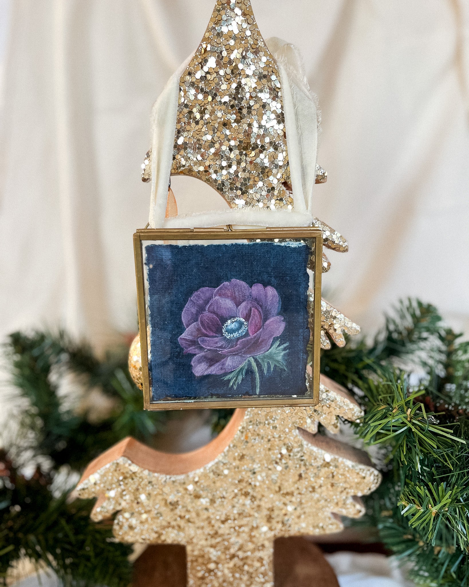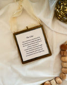 - Size: 4" x 4" brass and glass frame with a slider clasp closure, adorned with a velvet ribbon for hanging.