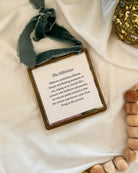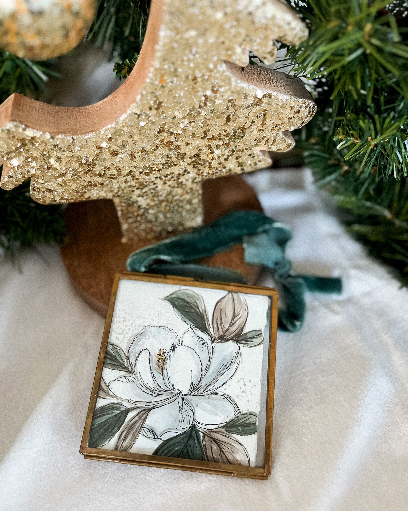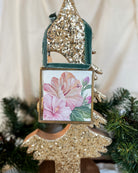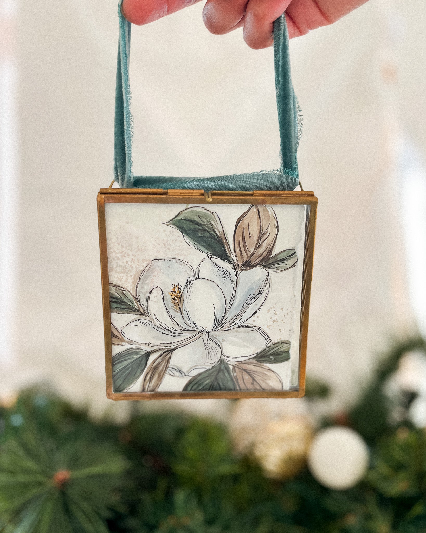 - Size: 4" x 4" brass and glass frame with a slider clasp closure, adorned with a velvet ribbon for hanging.