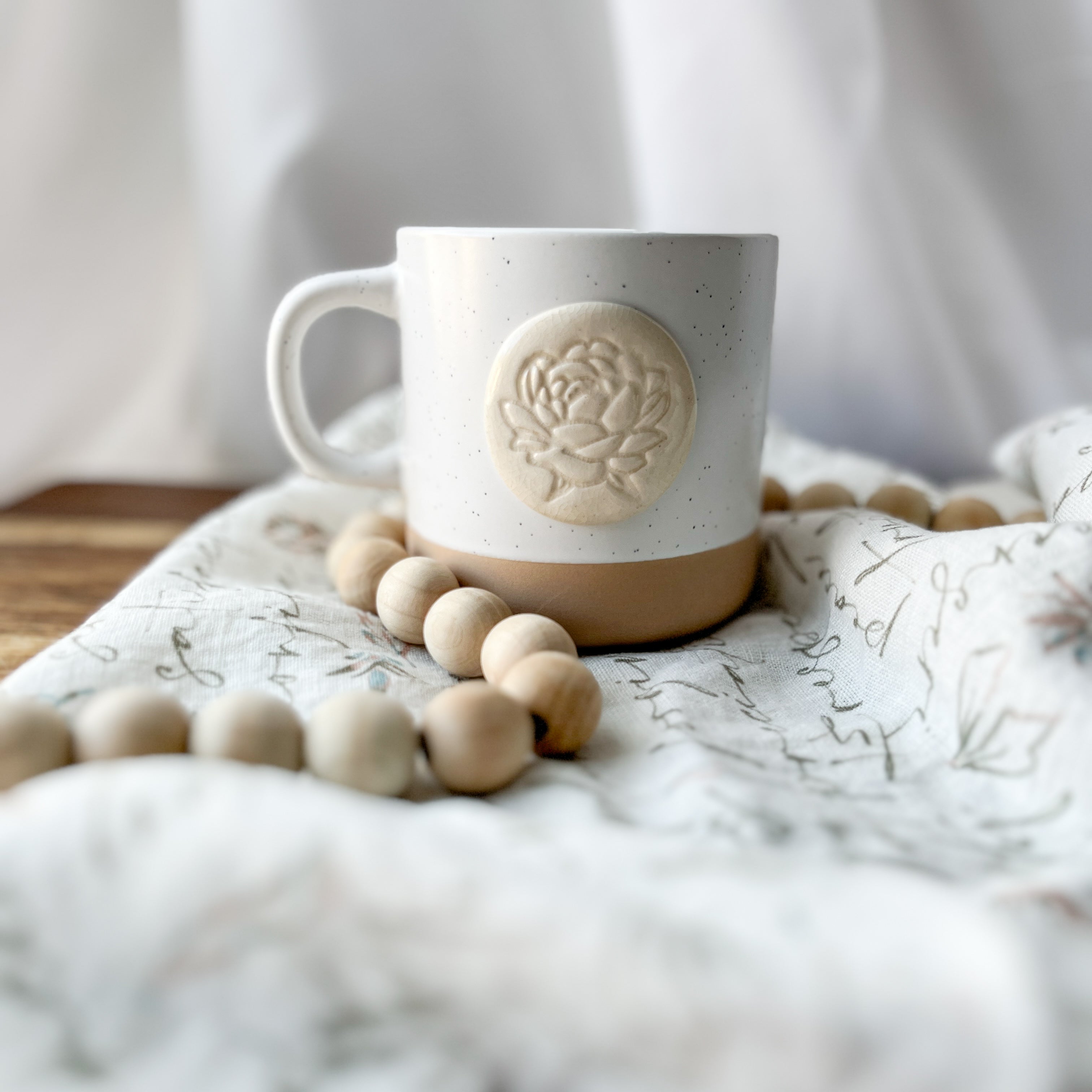 Crafted from high-quality ceramic and adorned with peony on the coin emblem which symbolizes beauty, grace, and compassion. It can serve as the perfect gift for a friend, loved one, or as an elegant addition to your coffee and tea bar.