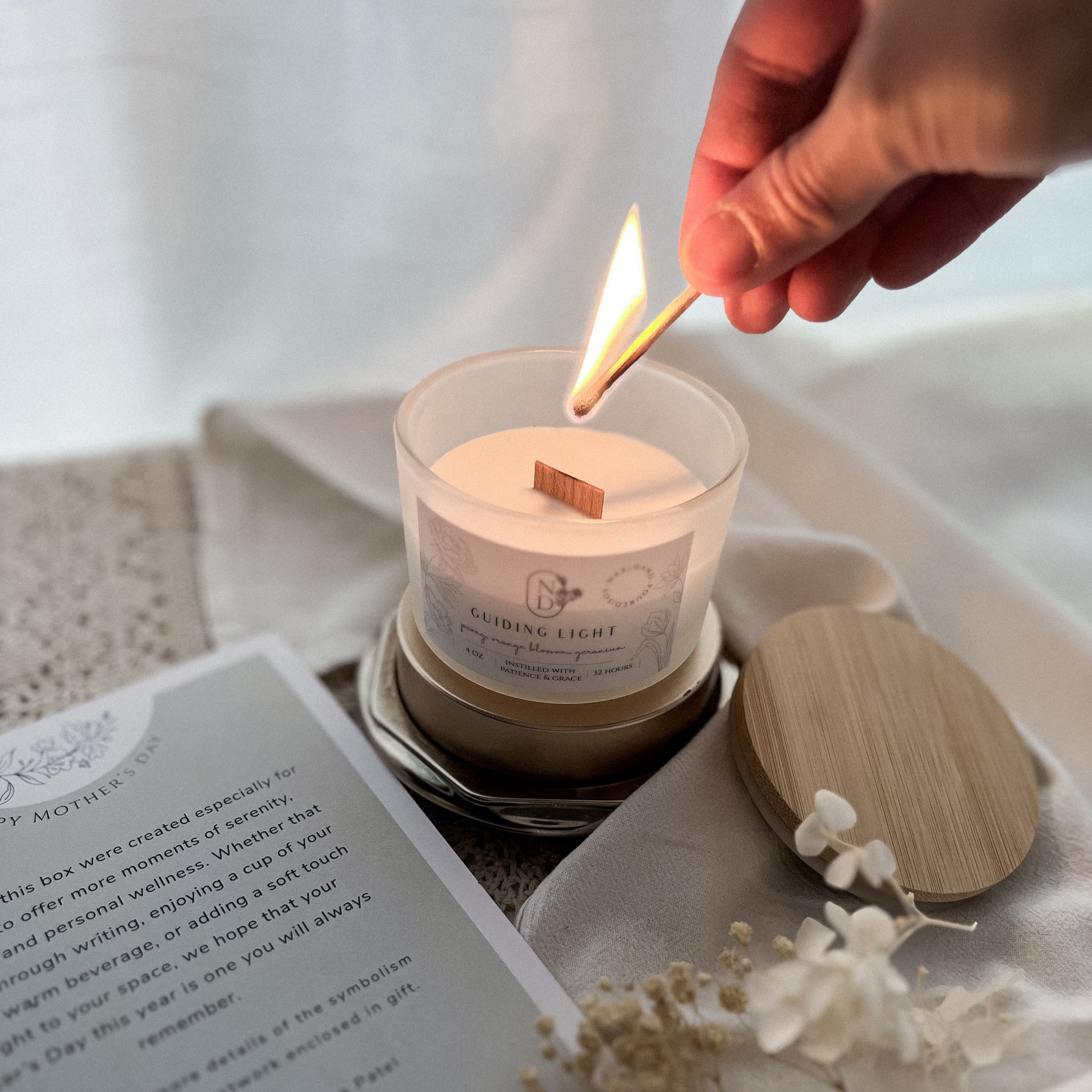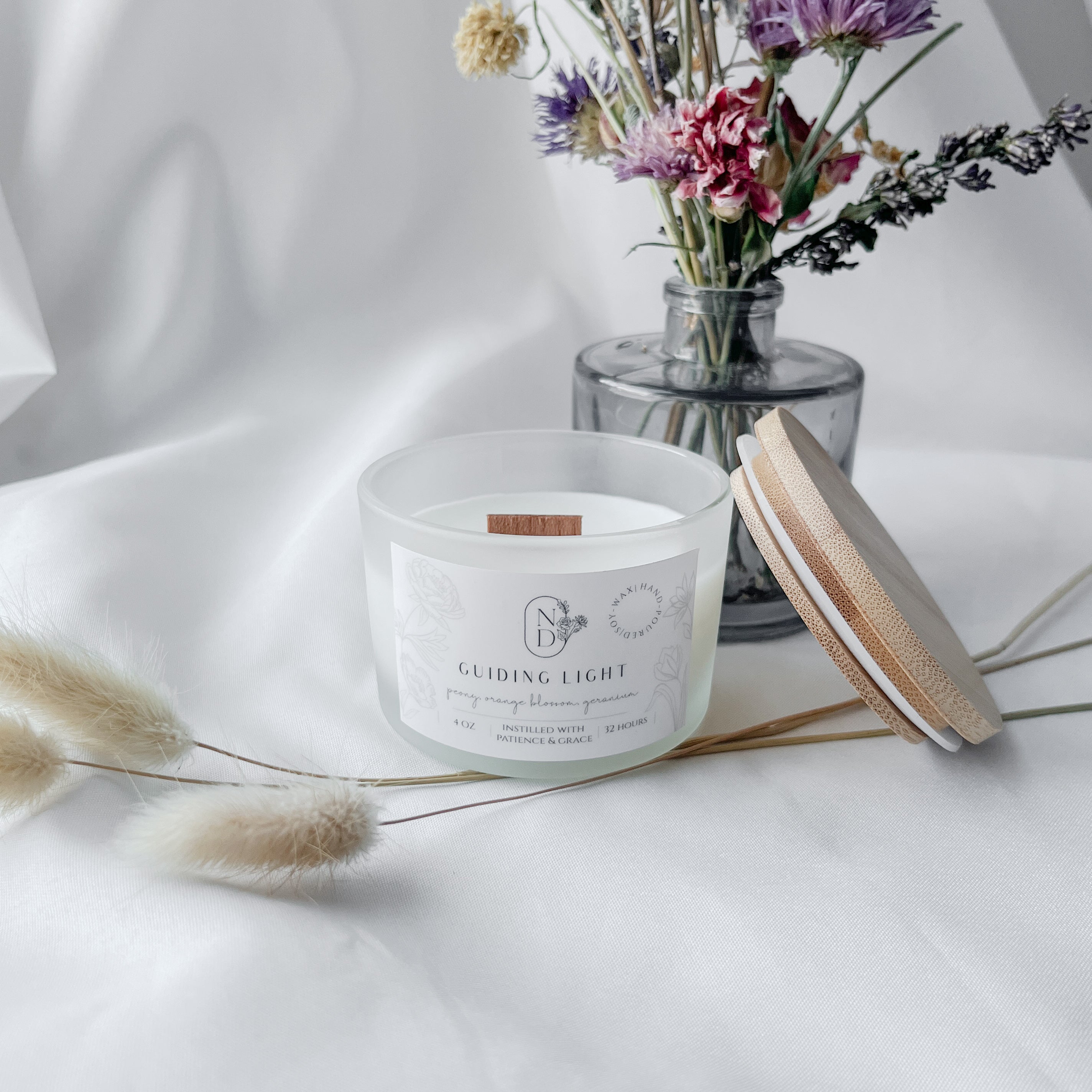 - A 4 oz candle, housed in a frosted glass vessel with a bamboo lid and wooden wick that emits a fresh scent of peonies, orange blossoms, and geraniums, perfect for bringing tranquility to any space
