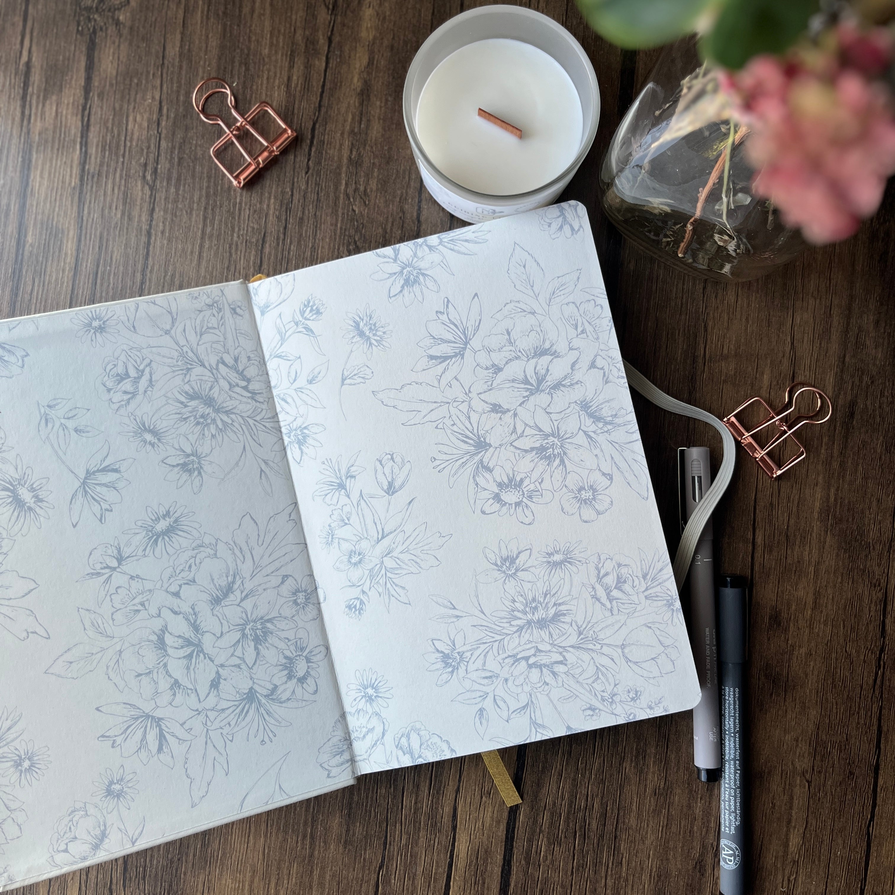 - A faux leather notebook, elegantly stamped with gold florals, equipped with an elastic band closure, gold ribbon divider, and lined with a blue floral pattern it can serve multiple needs for busy mothers | lays flat
