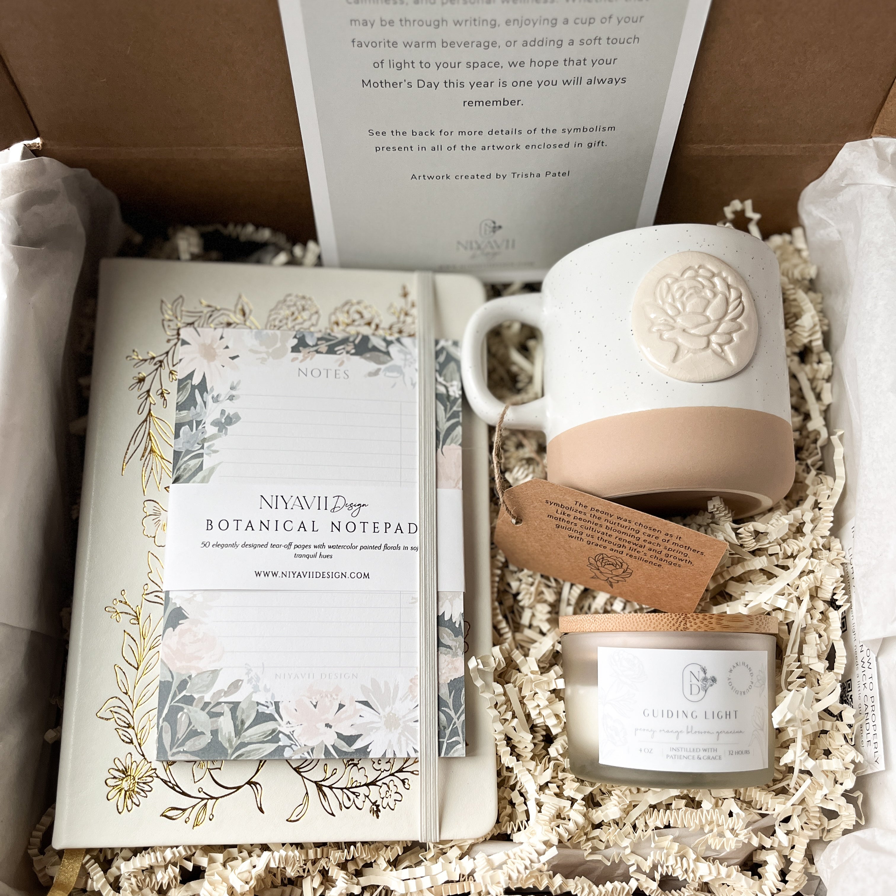 This Mother's Day gift box was thoughtfully curated with a collection of items each infused with deep meaning and symbolism. The artwork that adorns every piece was created specifically to honor the many beautiful qualities and boundless compassion of mothers. Delicately packaged in a box decorated with watercolor florals, it includes a special postcard explaining the symbolism behind each flower found on the notebook, notepads, and box surface.